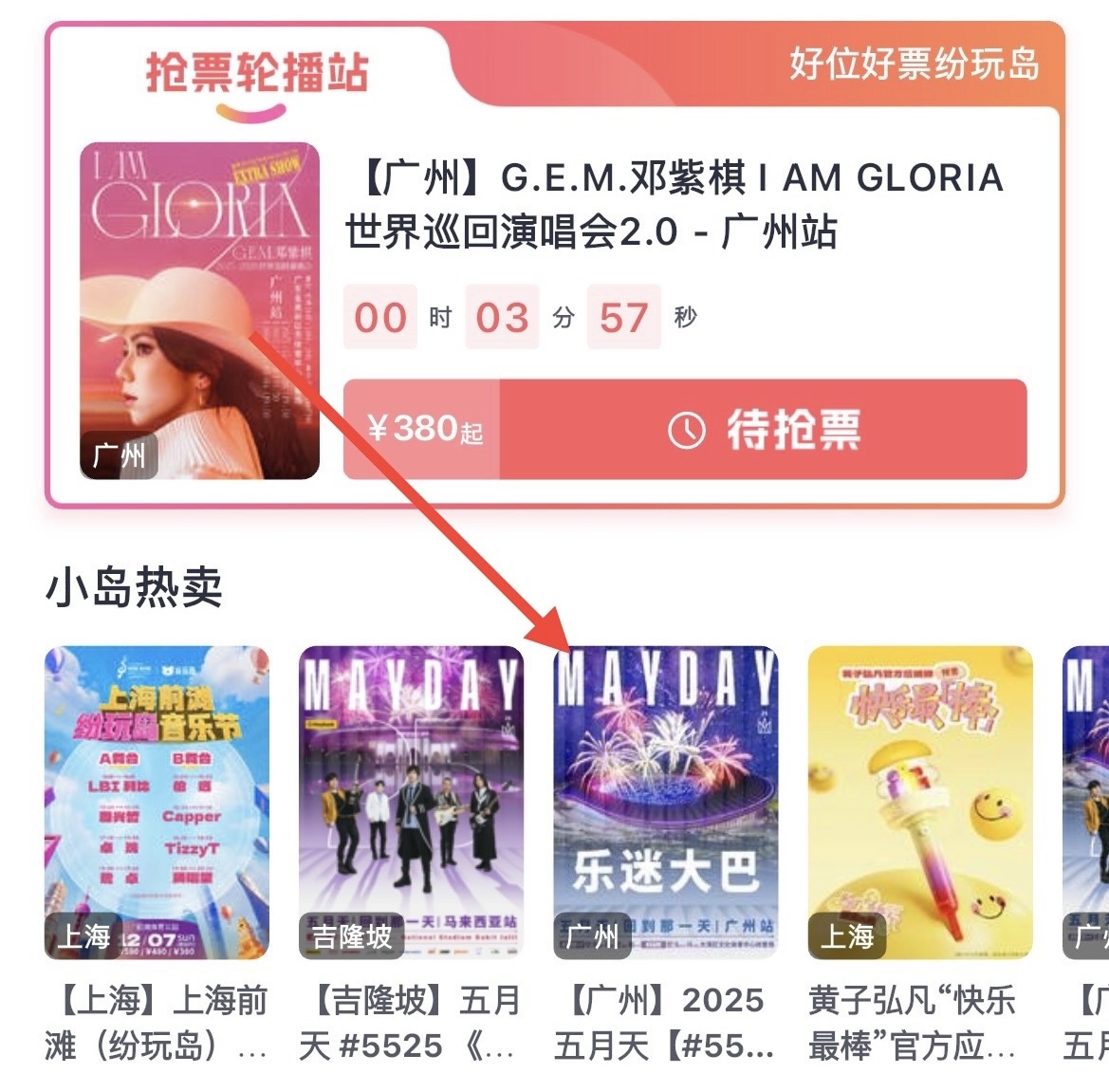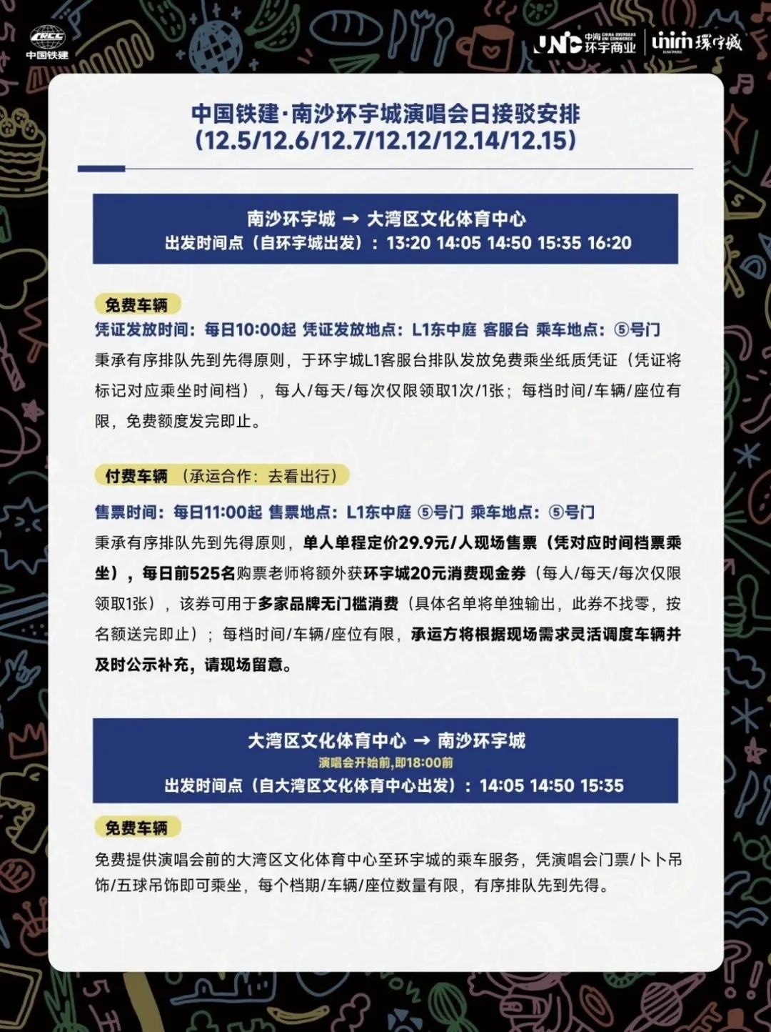 如上演当日不雅众在完成MAYDAYLAND扭蛋后,需从南沙环宇城启程赶赴场馆,可搭乘南沙环宇城的接驳车,凭票或把握吊饰即可免费乘坐,座位有限先到先得,启程时刻点为13:20、14:05、14:50、15:35、16:20。