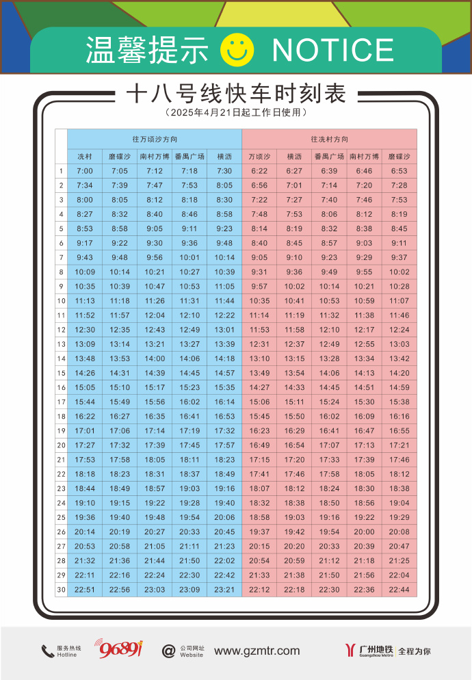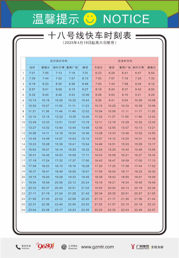 值得刺眼的是,地铁18号线开行有快车和粗野车两种,冷落给与搭乘快车车次,约35分钟可从市中心直达万顷沙。快车时刻表单干作日和周末两种,不雅众可按表查询各站快车启程时刻。
