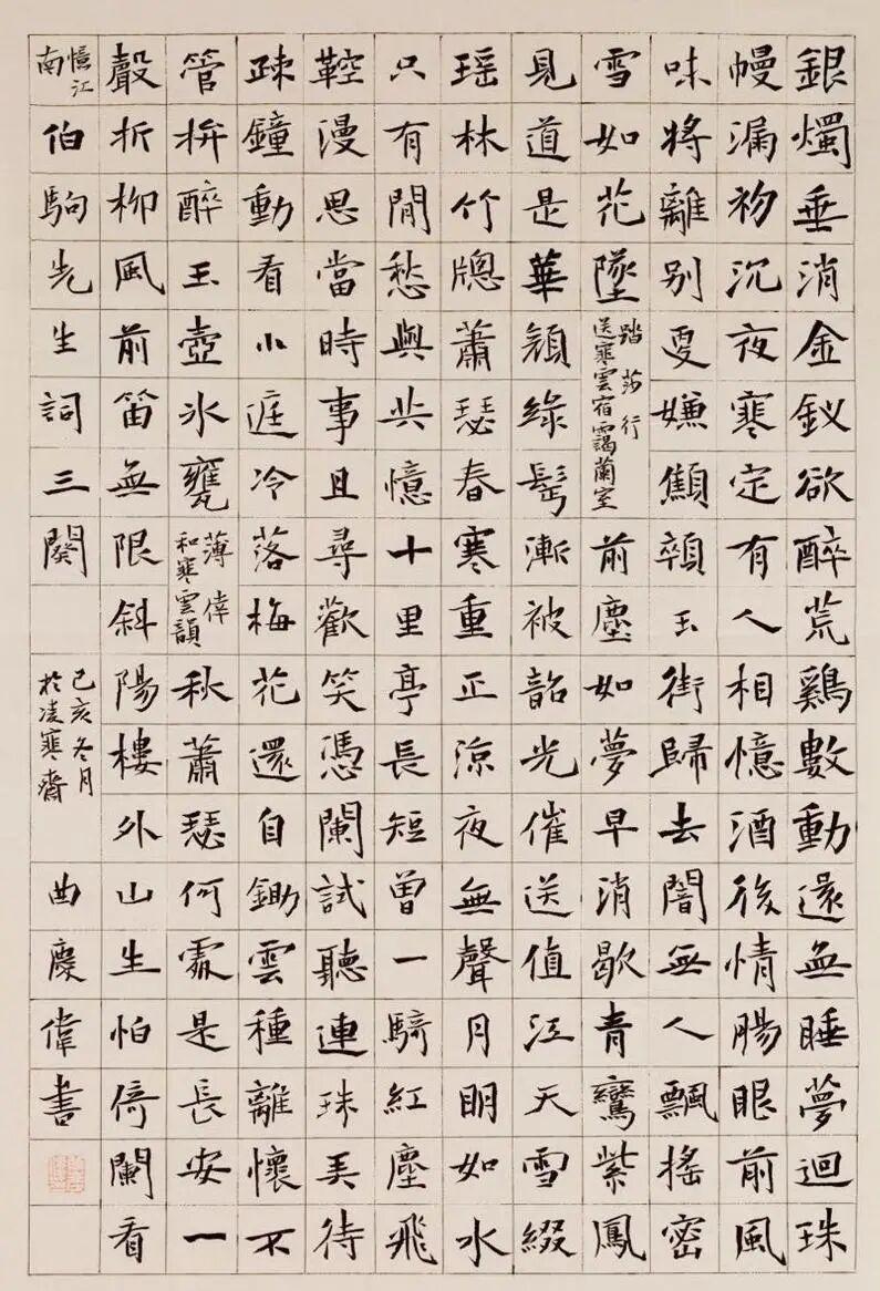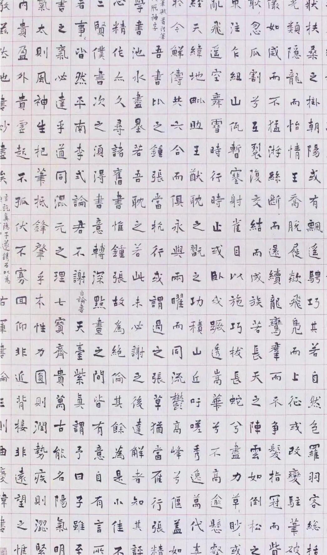 魏碑体是楷书的一种,跟行草书不相同。行草书连在通盘,笔画检朴,单看一个字不太符合。但楷书,尤其像曲庆伟这么在格子里写,每个字寥寂又规整。是以,东说念主们看楷书时,更真贵每个字的口头。