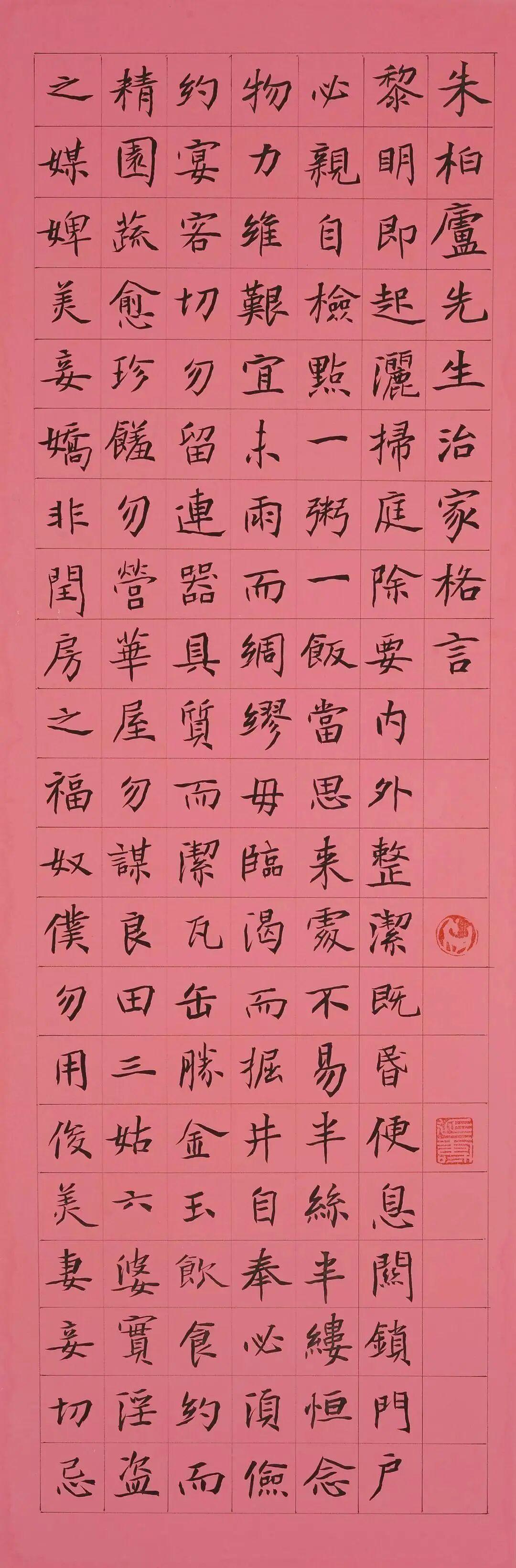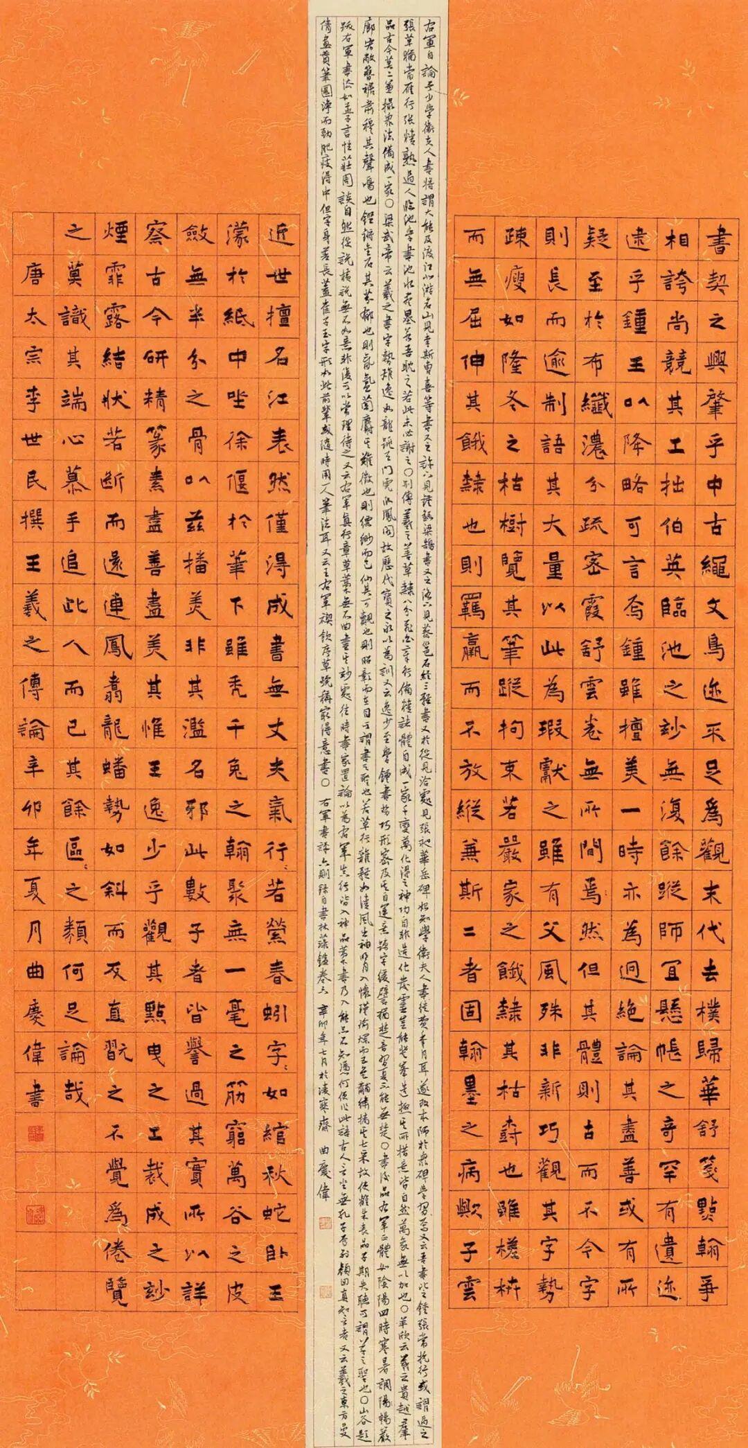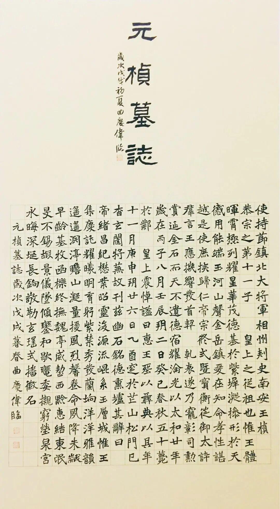 曲庆伟在兰亭奖上获一等奖的作品是大篇幅魏碑中堂,他在画好的格子里写了 600 多字。因为字多篇幅大,自后公开的贵寓基本王人是局部图,很少有东说念认识过好意思满的。